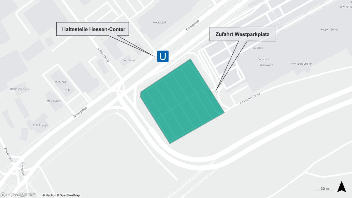 Der Westparkplatz bzw. Außenparkplatz kann über die Borsigallee aus westlicher Richtung erreicht werden. Nehmen Sie von der A66 kommend die Ausfahrt Bergen-Enkheim und fahren Sie direkt rechts ab auf die Borsigallee Richtung Hessen-Center/Bad-Vilbel. Biegen Sie danach direkt rechts ab auf den beschilderten Außenparkplatz des Hessen-Center.